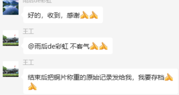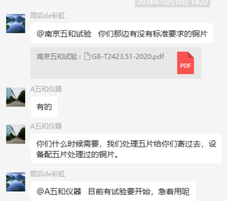 為了更好地說明銅片試驗(yàn)的重要性,下面分享一個(gè)檢測公司的銅片試驗(yàn)實(shí)際案例:2024年8月份合肥******檢測技術(shù)有限公司第一次采購我司一臺型號為“WHQ-300B”型的混合氣體腐蝕試驗(yàn)箱,設(shè)備被運(yùn)送到客戶指定的場地安裝調(diào)試運(yùn)行。安裝調(diào)試后,客戶后期自行進(jìn)行一次銅片增重試驗(yàn),我司技術(shù)人員進(jìn)行線上指導(dǎo)操作,試驗(yàn)結(jié)束之后客戶將數(shù)據(jù)發(fā)給我司,以下是客戶和我司聊天記錄以及客戶做的數(shù)據(jù)信息: